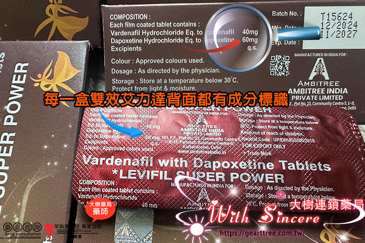 雙效艾力達由印度Ambitree藥廠生產,每粒含有: