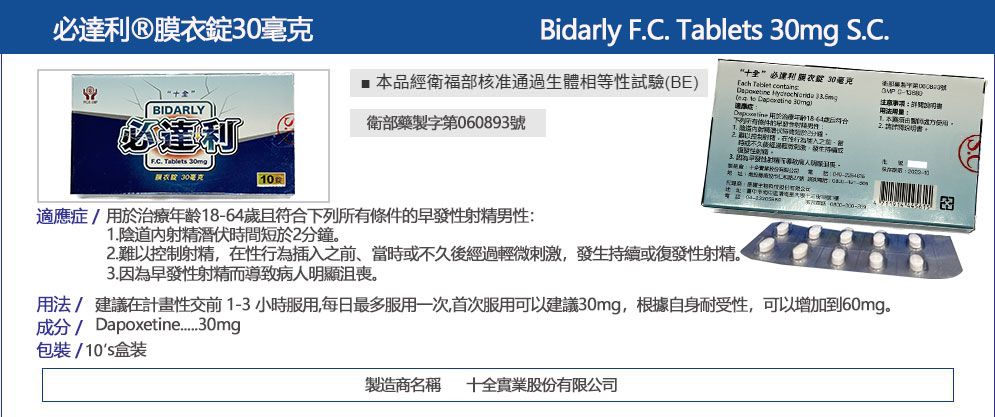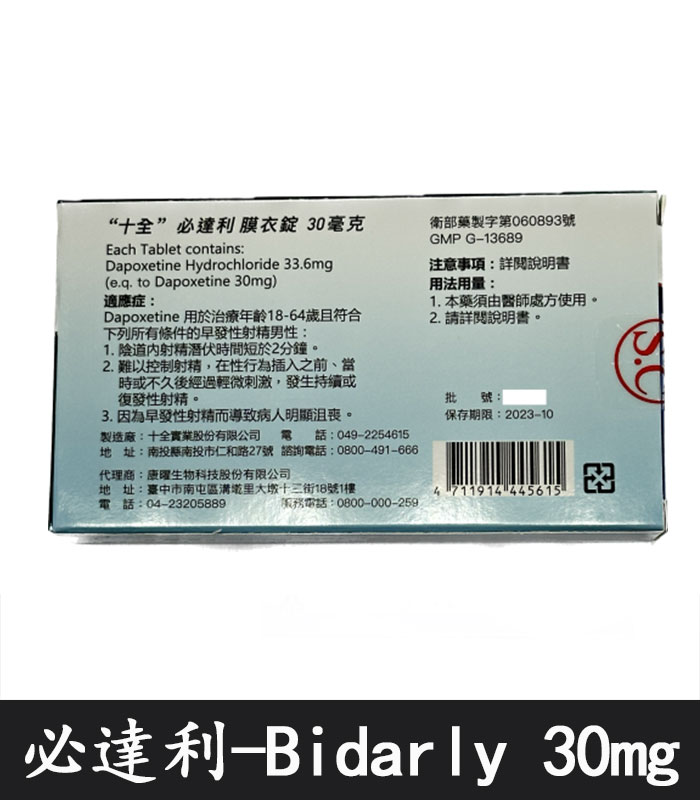 • 成分含量:Dapoxetine 達泊西汀 30毫克