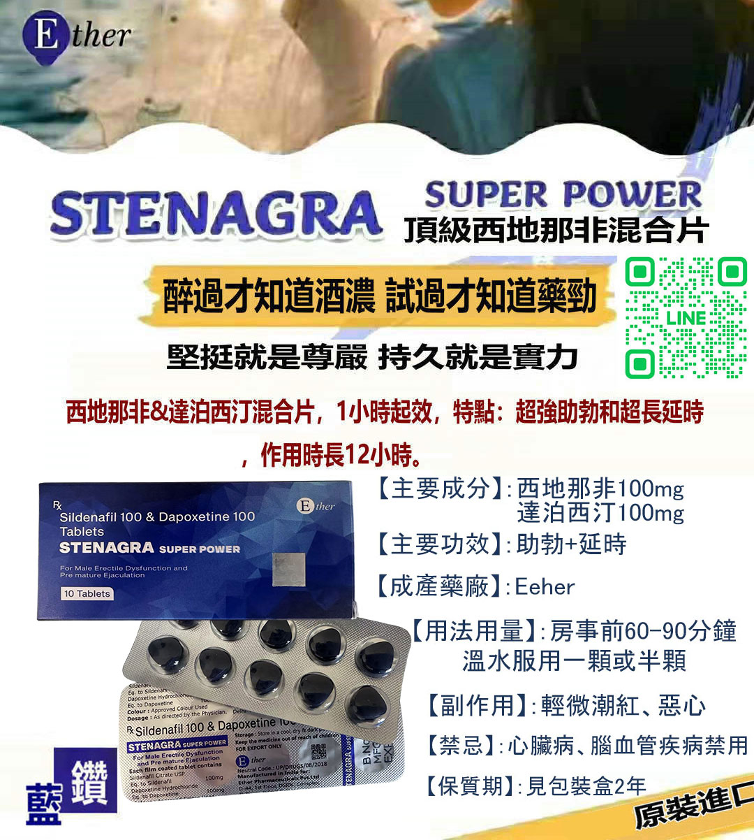 印度藍鑽 Stenagra Super Power 由印度 AMBITREE 藥廠研製的超級威而鋼,採用雙效配方,結合 西地那非(Sildenafil) 的強效助勃與 達泊西汀(Dapoxetine) 的延時作用,一顆即可同時解決 勃起障礙(ED) 與 早洩(PE)。不論是追求堅挺硬度,還是延長激情時刻,印度藍鑽都是兼顧硬度與持久力的男性首選。