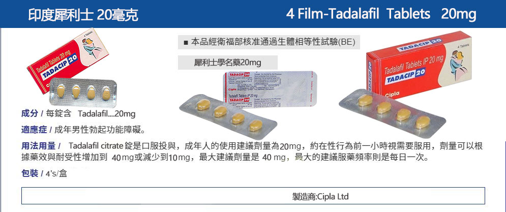 印度犀利士tadacip20,壹片含有20毫克的他達拉非。印度犀利士效果好,起效快,幫助勃起,增強硬度,功效在30分鐘內開始,並持續約48小時以上。